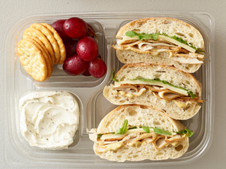 Turkey, NY Cheddar, Arugula & Dijonnaise on Rustic Baguette, Grapes, Crackers & Vegetable Cheese Spread